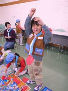 | ビーバー隊も勢ぞろい。 この日に入隊したスカウトがなんと6名。 仲間が増えてとってもうれしいね。 そろいの衣装は最高だ。 |