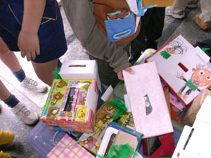 | 一見、大変な募金ですが、 この、募金箱を見てください。 それぞれ、イメージを膨らませて作っています。 もちろん、喜んで、楽しみながら、自主的に。 人間が出来てますね〜〜〜〜〜 |