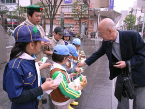 | 年少のスカウトもいるのですが、 彼らも立派に社会に役立っていました。 ほんとに素晴らしいと、自画自賛・・・・・・ でも、この年齢から、社会貢献を自然に実につけ、 市民としての、責務を果たせる人間に成長する事は、 大切な事だと思います。。 |