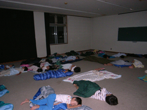 | そして、恒例の、夜の運動会!! 主のいないタオルケットや寝袋が・・ ぐっすり眠れなかったスカウトも いたようですが |