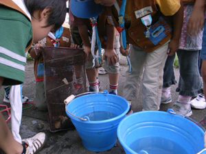 | おやつを食べて、一休みです。 夏の暑さにも、負けない元気な スカウトたちです。 |