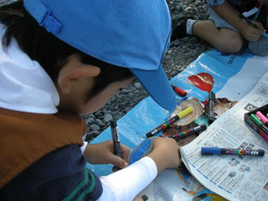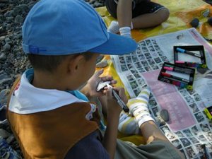 | ビーバー隊の集会です。 今日は天気も良く、安倍川で 野外料理です。 先ずは、マッチの擦り方 結構大変、時々熱い!! |