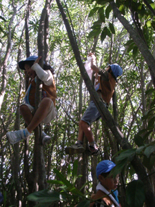 | 腹ごしらえした後は、 探検に出発。 こんなやぶもなんのその。 本当は、茨もあったりして、結構 大変なんです。 でも、ビーバーたちはへっちゃらだ。 |