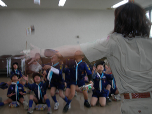 | ビーバーの集会は 雨のため室内に。 先ず、紙芝居 「オサルノラッパ」 |