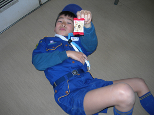 | そして、ベンチャーの 先輩スカウトが、宗教章を 授与されました。 もう一歩で「富士スカウト」です。 うれしいね。 |