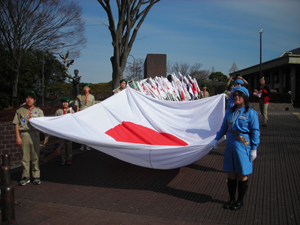 | これは出発前の、 和やかな様子。 国旗を持つ2つのお約束。 旗は地面につけない! まっすぐ保持する! |