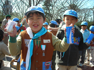 | パレード後は 紅白餅とジュースを頂き ご機嫌のスカウトたち。 |