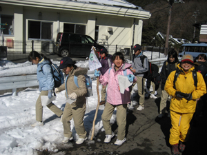 | 深い雪の中を、進みます。 道があるところばかりではないので、 コンパスを使ったり、 3点直進法で進みます。 班のまとまりが大事です。 |