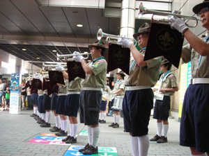 | そこで、警報が出る前に 奉仕のために集合していた 年長のスカウトと、リーダーで 開会式のファンファーレを吹奏。 相当さびしい陣容です。 |