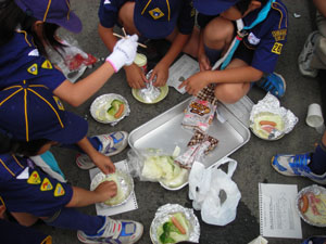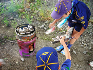 | カブ隊はキャンプに向けて 炊事の訓練。 |