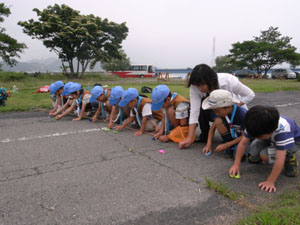 | 片付け後は、安倍川に 朝の安倍川で体を動かしました。 |