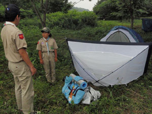 | 翌朝の点検です。 テントの乾燥も大事な事。 隊の資材を大事に使うため、 乾燥は欠かせません。 |