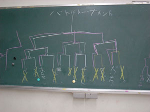 | カブ隊の集会、バトルトーナメント すごい対戦表です。 バトルの内容は、 ロールマットチャンバラ・・・・・・ |