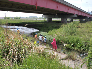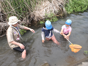 | 胸まで水につかって こうしないと魚は取れません。 安倍川の伏流水が 沸き水となって出ているところです。 とっても澄んでいて、 いろいろな生き物がいました。 |