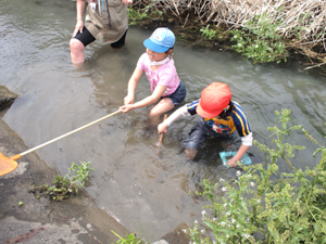 | 獲物は、アユ、ヨシノボリ、アユカケ? カワエビ、ヤゴ、ドジョウ等でした。 ずぶぬれの後は、自分で着替えます。 |