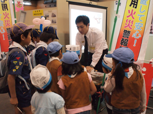 | 消防署のコーナー。 みんなは、火遊びはしません と言う約束をして 素敵なお土産をいただきました。 |
