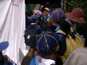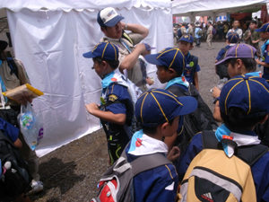 | 隊長を見つけて、 ジャンボリーの話を聞きました。 この後、プログラムの様子を 見学しました。 地区のみんなでバス5台、 楽しかったですね。 |