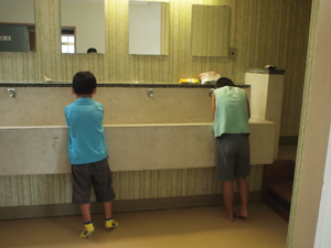 | その後は洗面。 朝食後に洗面 と言う家庭もありますが 26団では、洗面が先です。 キャンプだと、朝食までに 結構、時間がありますから。 |
