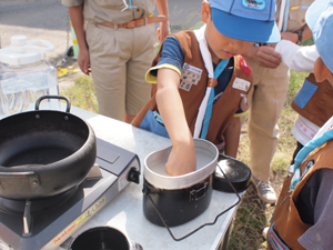 | 先ずは、ご飯を炊きます。 隊長のやり方を、 良く見て覚えてね。 |