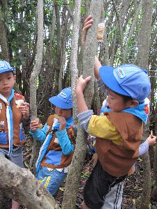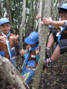 | 最初は、木登りしたくないと 言っていたスカウトも、 面白いといって、どんどん登ります。 |