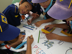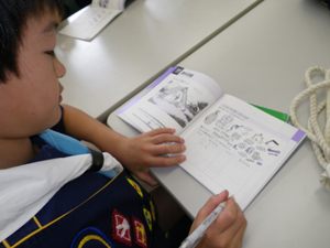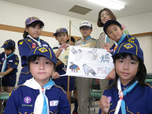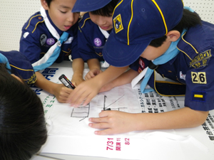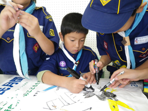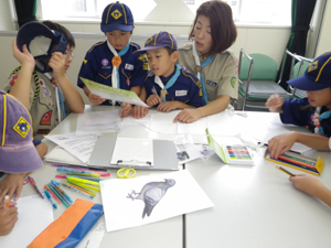 | 今日は、組のシンボルの旗を 作りです。 前回の集会で決めた鳥の デザインを決めます。 各組でいろいろ工夫しました。 |