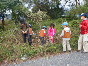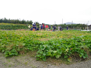 | 先ずは、収穫の方法を 隊長から教わります。 はたしてお芋は育っているでしょうか? 今年は夏の猛暑があり 農作物の生育が 不順らしいです。 |