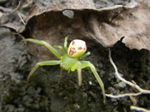 | こちらはいたずら書きではありません。 なんと、人面蜘蛛。 多分「ハナグモ」です。 それにしても、 ユーモラスな顔でしょ |