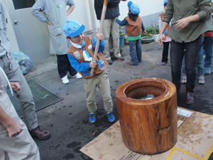 | その後は、もちろん 御餅つき リーダーに教わりながら 力をこめます。 |