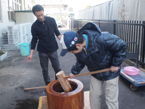 | 副長は、さすが、 慣れたものです。 若いから力強く、美味しい御餅に なります。 お父さん方にも 手伝って頂きました。 |