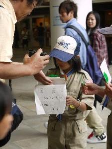 |  | 街頭での募金の様子です。 最初は恥ずかしかったけど 大きな声を頑張って出しました。 募金をして下さった皆様 どうもありがとうございました。 |