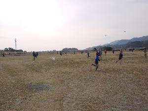 |  | カブ隊は、元気いっぱい。 凧上げです。 少しでも高く上げよと 河川敷の運動場を 思いっきり走っています。 |
