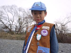 | こちらは、 団のロゴ入りパーカに 身を包んだ ボーイ隊副長の ご子息 早く起こされてご機嫌斜め |  |