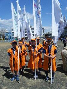 |  | カブスカウトも お祭に参加です。 市内をパレードします。 集会で作った個人ののぼり旗! 決まってるね。 |