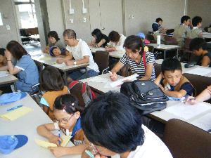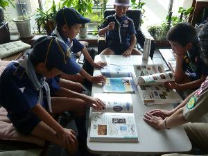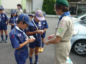 |  | カブ隊の隊集会です。 隊長から今度の釣り集会で 使うものが組長に渡されています。 |