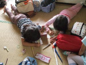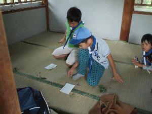 | キャンプの思い出を葉書に書いて 家に送ります。 未就学のスカウトは、 葉っぱで絵を書きました。 |  |  |