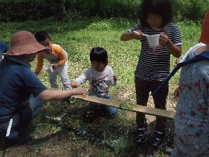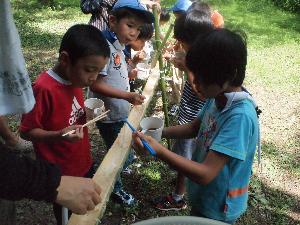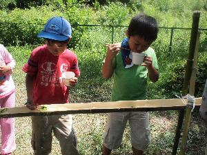 | 最後は流しソーメン。 団委員長とお父さん達の、傑作です。 料理は団委員会の皆様。 大歓声が上がりました。 | ||