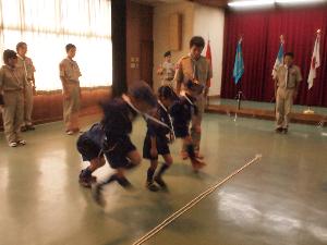 |  | 今日は上進式です。 1年の始まりと終わりを同時に行います。 ビーバー隊からカブ隊へ 隊長の「とべ」合図の下、しっかり 上進していきました。 |