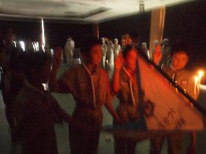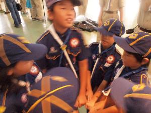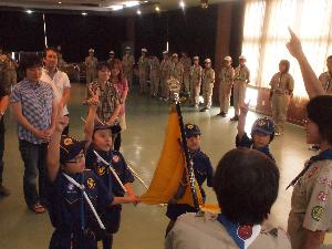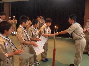 | そして、やくそくの式 やくそくを唱えたスカウトが カブ隊への入隊を許されます。 スカウトサインが素晴らしいですね。 |  |