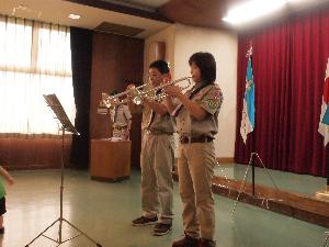 |  | 上進式と総会の間のミニコンサート 何とベンチャー隊の副長は プロオーケストラのトランペット奏者 「永遠のスカウト」と「名誉にかけてぞ」を 吹いて下さいました。 横の団委員長は、ご愛嬌・・・ |