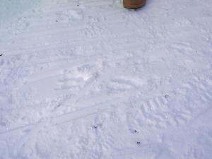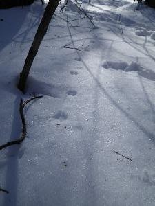 |  | カブ隊も、動物の足跡見つけました。 前日の夜、ボーイ隊がハイク中に発見した動物の足跡を絵に描いて、 カブスカウトに説明してくれてました。 それもあって、どんどん見つかります。 タヌキかキツネ(左上)、ウサギ(上)、シカ(右上)、テン(左)。一部推測ですが・・・・・ 普段見つける事が難しい足跡。雪があってこその発見でした。 | |