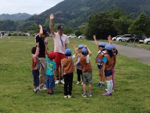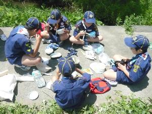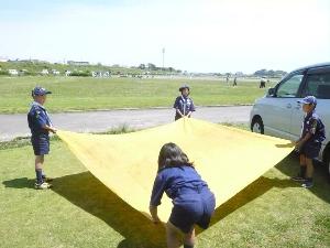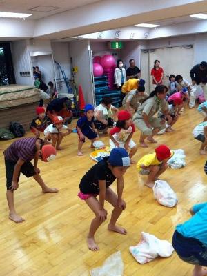 | 二日目は着衣水泳 先ずはしっかりと準備体操 地区内の他の団のビーバー隊と 合同で体験しました。 |  |