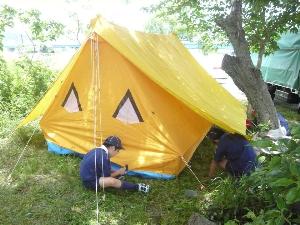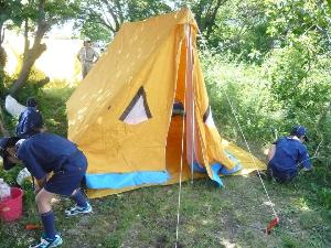 | 組で協力してテントを張ります。 サボっている人がいると 作業が進みません。。。 |  |