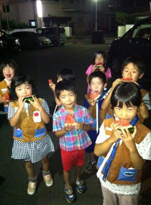 |  | ビーバー隊はキャンプに向けて 1泊で宿泊練習 場所はいつもの青少年会館です。 差し入れのスイカを頂き、大満足です。 |