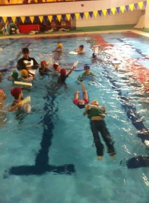 |  | そして体を慣らします。 通常の水泳と違うのは、 普段の服装でいることです。 |