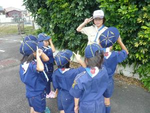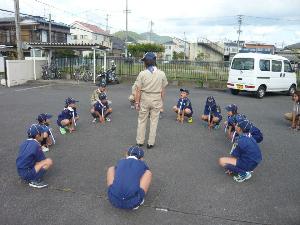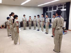 | 各班の集合を上級班長に 報告します。 班員は、気をつけ だらだらしていると やり直しです。 |  |