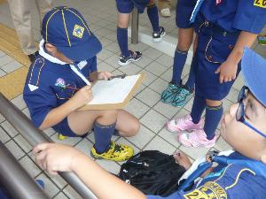 |  | 隊長も張り切ってます。 スカウトは、 豪華シール満載のカードを 見せてくれました。 笑顔が良いですね。 |