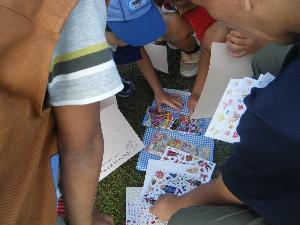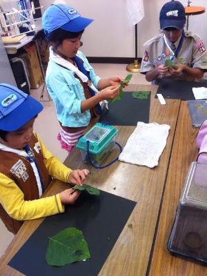 |  | さっき集めた葉っぱを使います。 今日は、東京からも 助っ人のリーダーが。 ありがとうございます。 |