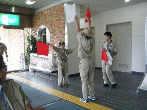 | さっそく、隊集会セレモニーで スカウトサイン かっこいいぞ |  |