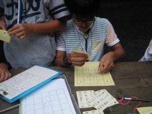 |  | ビンゴカードを作って、 自然みつけに出発 自分でカードを作るので ここから智恵比べです。 見つけられそうな奴を角に… |