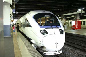| 博多駅で 883系ソニックを見つけた娘が あれに乗りたいと言い、 指定を取りました。 でも、やってきたのは 白いソニック。 |